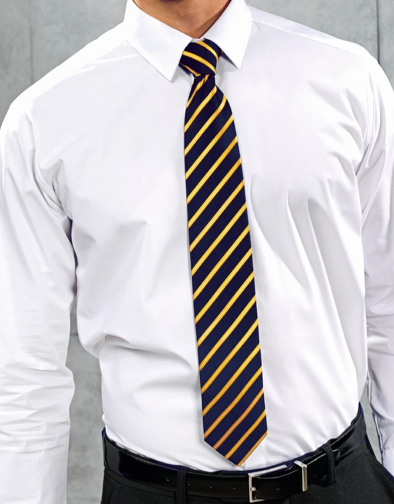 Eine klassische Sports Stripe Tie, getragen als traditionelles Teamwear-Team für diejenigen, die einen zusammenhängenden Look suchen. Schmale Streifen sind über die gesamte Länge der Krawatte eingewoben und sorgen für einen angenehmen Stil.