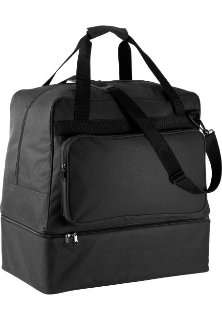 Sporttasche aus 600D Polyester mit doppelter PVC-Beschichtung, 90 Liter. Fester, abnehmbarer Boden aus PP mit Kunststoff-Standfüßen. Reißverschlusstasche vorne zur leichteren Veredelung, Kartenhalter, abnehmbarer Schulterriemen mit Silikonpolster. Fester Boden im Lieferumfang enthalten.
