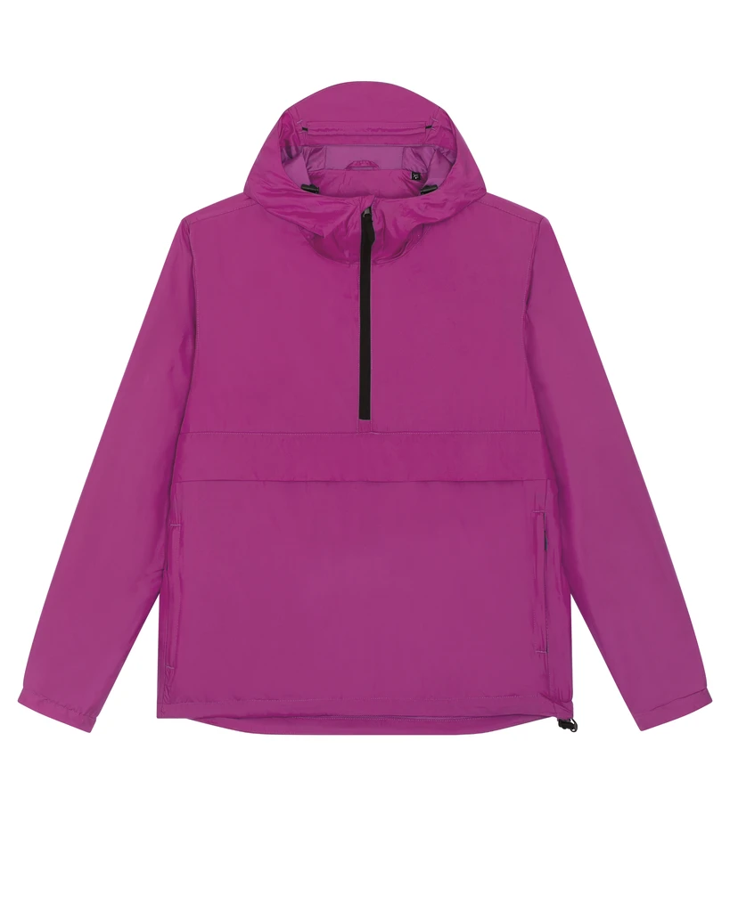 Material: 100% recyceltes Polyester, fluorfreie DWR; Gewicht: 75g/m²; Mittlere Passform, eingesetzte Ärmel, längere Rückenlänge mit abgerundetem Saum zum Schutz, unterer Saum mit verstellbarem Kunststoffstopper und elastischer Kordel, versiegelter Kapuzenschirm, doppellagige Kapuze mit verstellbarem Kunststoffstopper und elastischer Kordel innen, umgekehrter Nylon-Reißverschluss in der Mitte vorne mit Kinnschutz, Leistentaschen mit Reißverschluss und zusätzlichem Grosgrain-Puller, nicht funktionelle Klappe vorne und hinten, halbelastische Ärmelbündchen, Halbmond aus gleichem Stoff am Nacken, Innenreißverschluss am unteren Saum und Innenschlaufe mit Druckknopf am Armloch für einfachen Zugriff für Brustschmuck; Zertifikate: Global Recycled Standard (GRS), Fair Wair, STANDARD 100 by OEKO-TEX®, Peta - Approved VEGAN