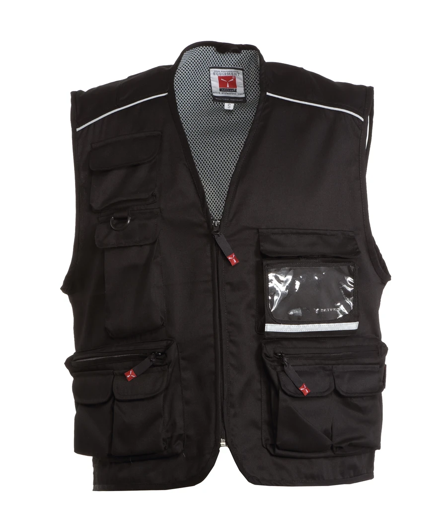 Summer vest, zip fastening, multi-front pocket system with reversible badge holder, reflex piping on the shoulders and back, roomy back hunting pocket. Contrasting colour dry-tech lining, open for easier printing and embroidery
