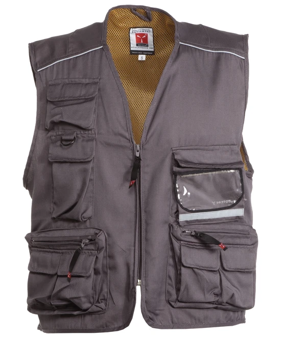 Summer vest, zip fastening, multi-front pocket system with reversible badge holder, reflex piping on the shoulders and back, roomy back hunting pocket. Contrasting colour dry-tech lining, open for easier printing and embroidery