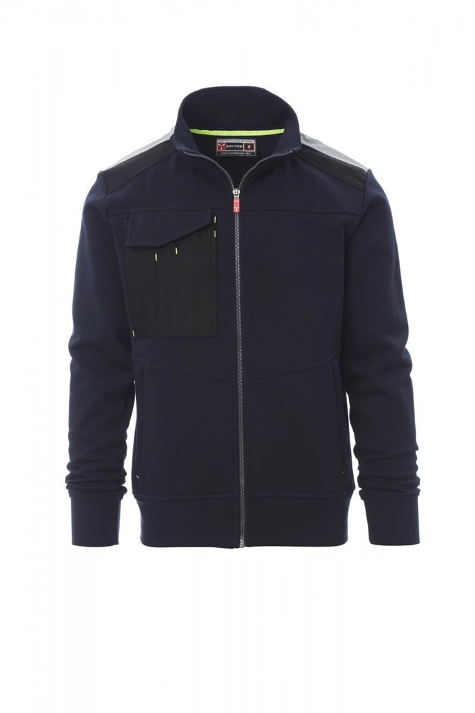 Herren-Sweatshirt, durchgehender SBS-Reißverschluss aus Kunststoff mit Autolock-Metallschieber, zwei Reißverschlusstaschen, eine multifunktionale Brusttasche mit verdecktem Einsteckfach für den Ausweis und Verschlusspatte mit „LOCK SYSTEM“, Reflexstreifen an den Schultern, elastischer Feinripp an Ärmelbündchen und Taille, Doppelnaht am Halsausschnitt, an den Ärmeln und an der Taille und Verstärkungsband am Nacken, Stoff mit wasserabweisender Behandlung