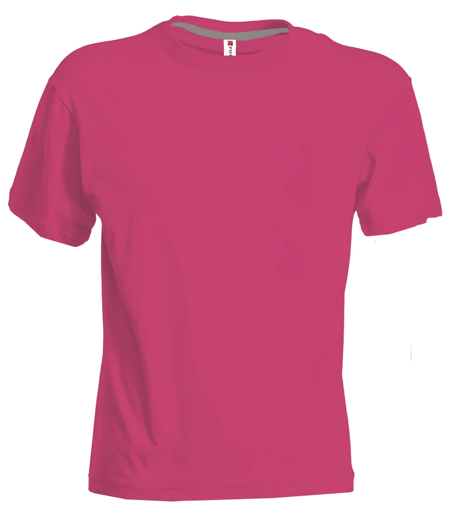 Kinder-T-Shirt mit Rundhalsausschnitt, kurzärmelig, Feinripp-Kragen 1,5 cm aus Spandex-Mischgewebe mit Kappnaht an der Vorderseite, Verstärkungsband in Kontrastfarbe von Schulter zu Schulter, das im Kragen sichtbar ist, Stretchnähten, Rundstrick