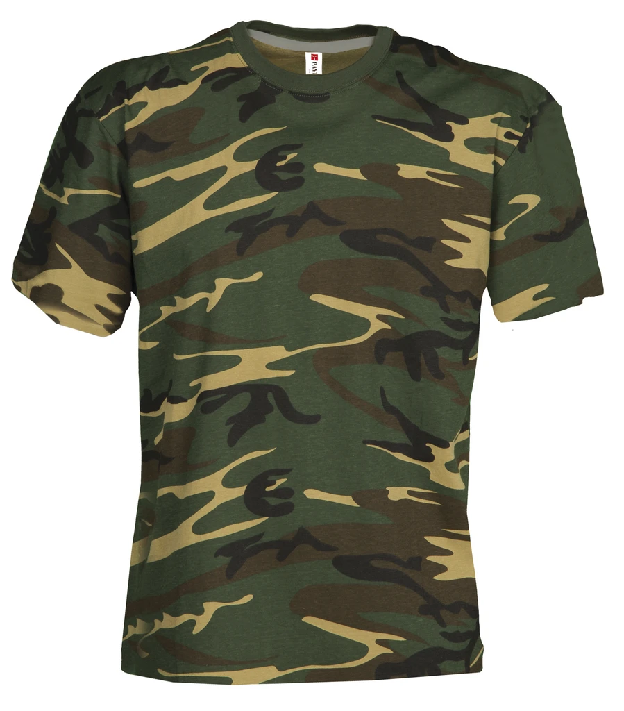 Kinder-T-Shirt mit Rundhalsausschnitt, kurzärmelig, Feinripp-Kragen 1,5 cm aus Spandex-Mischgewebe mit Kappnaht an der Vorderseite, Verstärkungsband in Kontrastfarbe von Schulter zu Schulter, das im Kragen sichtbar ist, Stretchnähten, Rundstrick (Tarnfarbe mit Seitennaht)