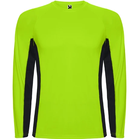 Langärmeliges Funktions-T-Shirt. Kombiniert mit zwei Polyestergewebe. Raglanärmel. Rundhals mit Nackenband. Microperforiertes Gewebe am Seitenteil und Armloch. Bequem und leicht anpassbar.