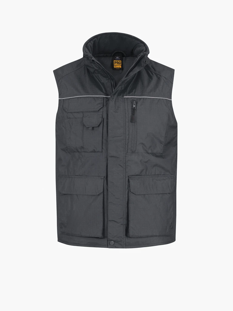 Außen: 100% Polyester (Ripstop) • Futter: 100% Polyester, wattiert • Stehkragen mit Fleecefutter • Full Zip mit Windschutzleiste • Elastischer Armausschnitt • Diverse Außen- und Innentaschen • Verlängertes, abgerundetes Rückenteil • Veredelungszugang über Zip im Rückenfutter.