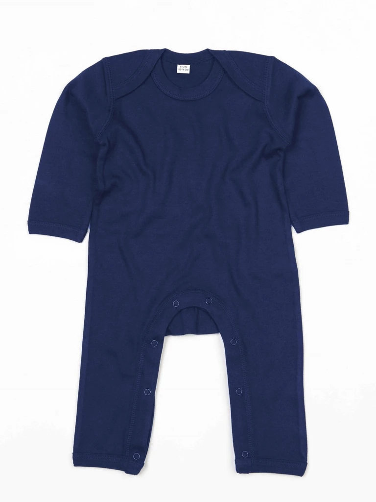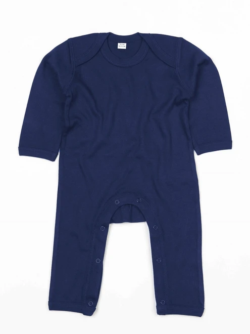 Lange Ärmel, Ganzkörper-Strampleranzug | Umschlaghalsöffnung | Selbstgebundene Bündchen, Beinöffnung und Halsausschnitt | Abgeschlossen mit einem schmalen Deckstich am Armloch und an der Innenseite der Beinöffnung | Gleichfarbige, nickelfreie Druckknöpfe an der Beinöffnung | Halsetikett in neutraler Größe zum einfachen Umetikettieren
