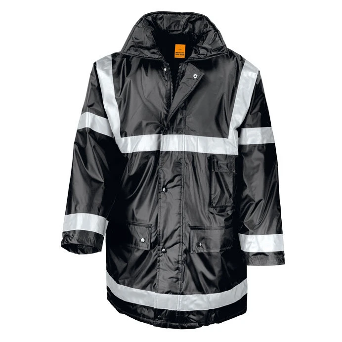Außen: 190 g/qm, 100% Polyester mit PVC-Beschichtung • Futter: 140 g/qm, 100% Polyester in Diamantstepp • Integrierte Kapuze • Versiegelte Nähte • Zip und Druckknopfblende • Große verdeckte Außentaschen mit Druckknöpfen, Innentasche • Umlaufende 3M Reflexstreifen • Zip im Rückenfutter zur Veredlung.