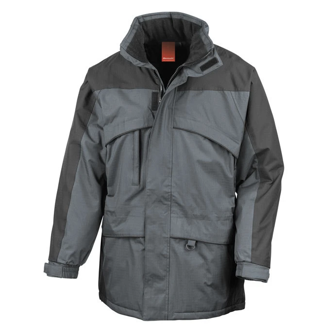 Außen: 100% Polyester (Ripstop) mit PVC-Beschichtung • Innenfutter: Oberteil 100% Polyester Fleece • Unterteil: 100% Nylon (Taffeta®, 190T) • Wattierung: 150 g/qm, 100% Polyester • Versiegelte Nähte • Abnehmbare, verstellbare Kapuze mit Klettverschluss-Kinnschutz • Full Zip mit Windschutzleiste und Klettverschluss • Netzeinsatz mit Zip unter den Achseln • Elastische Ärmelbündchen mit Klettverschluss • Brusttaschen und Zip-Vordertaschen, diverse Innentaschen • Kabelhalter, ID-Card-Halter • Elastischer Kordelzug mit Stoppern in Taille und am Bund • Reflektor auf unterem Rückenteil • Veredelungszugang auf linker Brustseite und im Rücken.