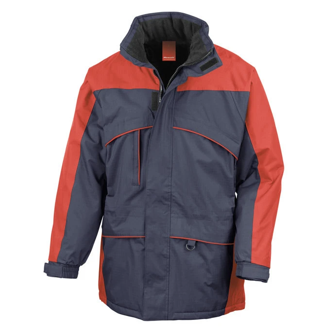 Außen: 100% Polyester (Ripstop) mit PVC-Beschichtung • Innenfutter: Oberteil 100% Polyester Fleece • Unterteil: 100% Nylon (Taffeta®, 190T) • Wattierung: 150 g/qm, 100% Polyester • Versiegelte Nähte • Abnehmbare, verstellbare Kapuze mit Klettverschluss-Kinnschutz • Full Zip mit Windschutzleiste und Klettverschluss • Netzeinsatz mit Zip unter den Achseln • Elastische Ärmelbündchen mit Klettverschluss • Brusttaschen und Zip-Vordertaschen, diverse Innentaschen • Kabelhalter, ID-Card-Halter • Elastischer Kordelzug mit Stoppern in Taille und am Bund • Reflektor auf unterem Rückenteil • Veredelungszugang auf linker Brustseite und im Rücken.