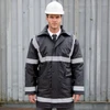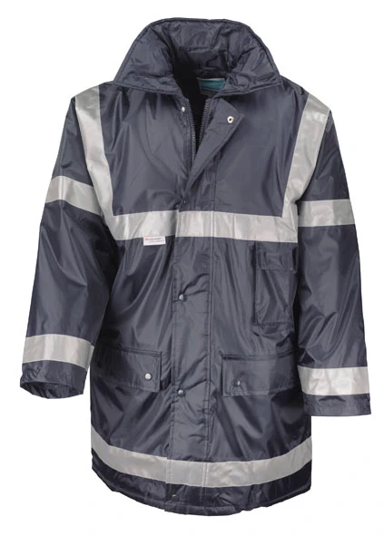 Außen: 190 g/qm, 100% Polyester mit PVC-Beschichtung • Futter: 140 g/qm, 100% Polyester in Diamantstepp • Integrierte Kapuze • Versiegelte Nähte • Zip und Druckknopfblende • Große verdeckte Außentaschen mit Druckknöpfen, Innentasche • Umlaufende 3M Reflexstreifen • Zip im Rückenfutter zur Veredlung.
