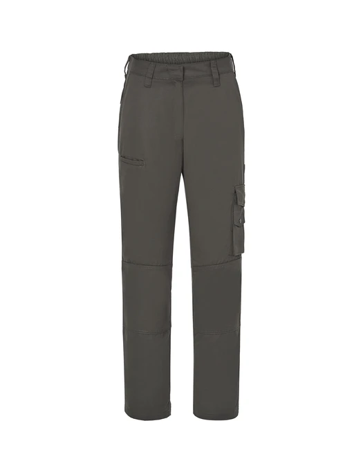 Elastischer Bund hinten und Verschluss mit verstecktem Knopf.