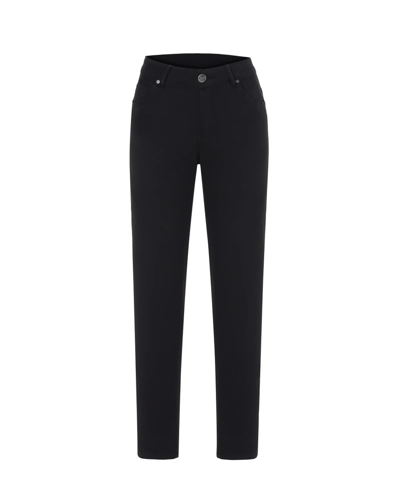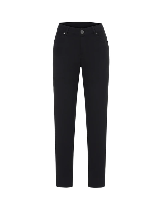 Bundverschluss mit Knopf, fünf Gürtelschlaufen, Reißverschluss und Nieten in Messingfarbe.