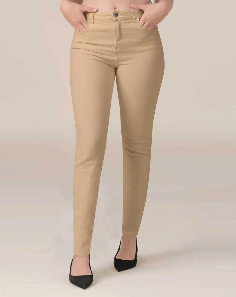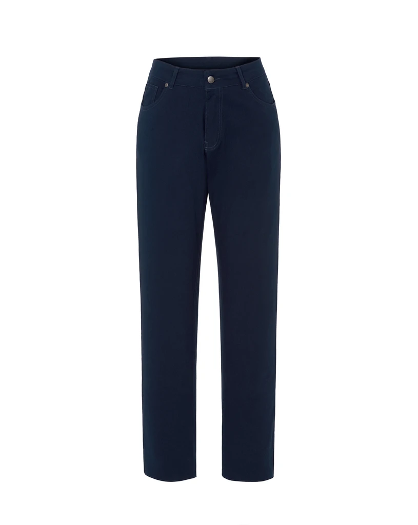 Bundverschluss mit Knopf, fünf Gürtelschlaufen, Reißverschluss und Nieten in Messingfarbe.