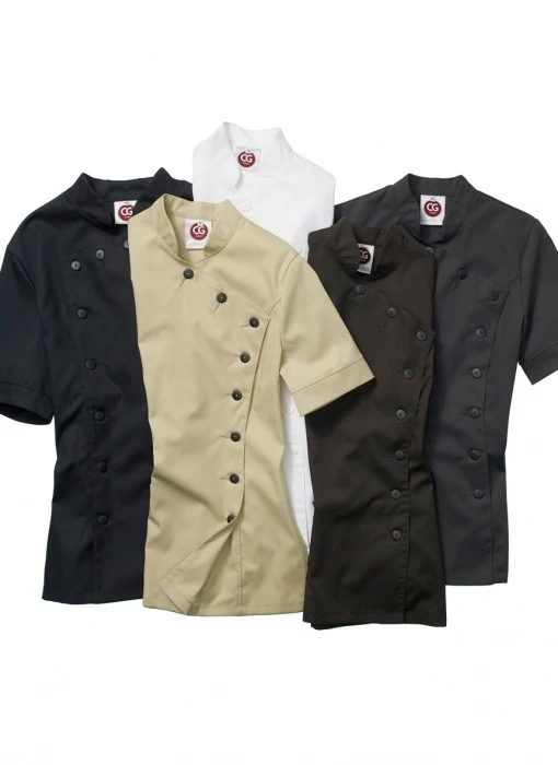Taillierte Tunika mit Kurzarm und Stehkragen. Besonders schön ist das schräg geschnittene Revers, das mit Knöpfen geschlossen wird. Die Tunika hat seitliche Schlitze und eine Rückenfalte für mehr Bewegungsfreiheit. Das hochwertige Stretchgewebe ist sehr bequem und leicht zu pflegen. Selbst bei Waschtemperaturen von 95° C bleiben Form, Farbe und Tragekomfort voll erhalten.