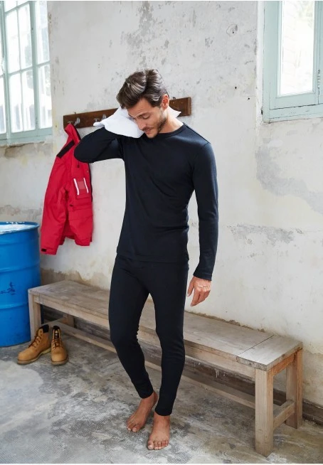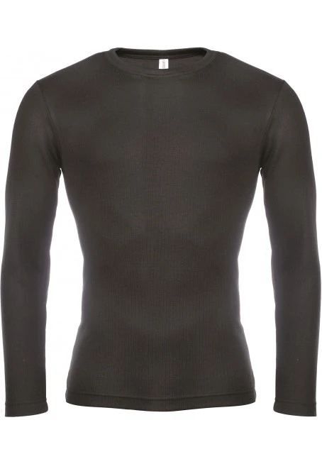 80% Polyester / 20% Viskose. Warmes Unterhemd. Rundhalsausschnitt. Doppelnaht an Ärmeln und Bund.