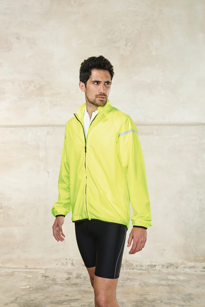 100% Polyester-Rohseide 300T. Wasserdicht 5000 mm. Atmungsaktiv 2.000 g / m2 / 24h. Reißverschluß. Netzeinsatz im Rücken zur Belüftung. Große Rückentasche mit Reflektstreifen. Elastische Kontrastpaspelierung an Ärmeln und Hüfte. Reflektierende Streifen Ärmel und Rücken.