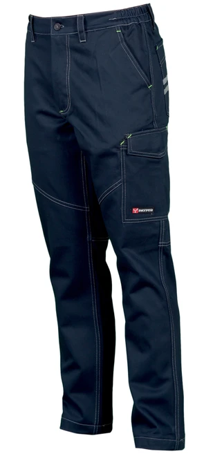 Klettverschluss, Dreifachnähten im Schritt und am Innenbein. Einsätze und Nähte in Kontrastfarbe, Reflexstreifen auf der Gesäßtasche, Dreifachnaht am Innenbein
