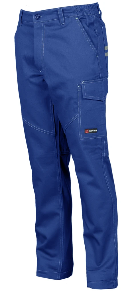 Klettverschluss, Dreifachnähten im Schritt und am Innenbein. Einsätze und Nähte in Kontrastfarbe, Reflexstreifen auf der Gesäßtasche, Dreifachnaht am Innenbein