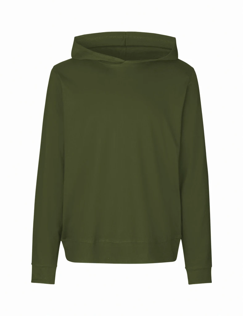 Material: 100% Bio-Fairtrade-Baumwolle, single Jersey Knit; Gewicht: 155 g/m²; Leicht montiert. Doppelt gefütterte Kapuze. Zweifache Manschetten an Ärmeln und Bund. Innenhalsband