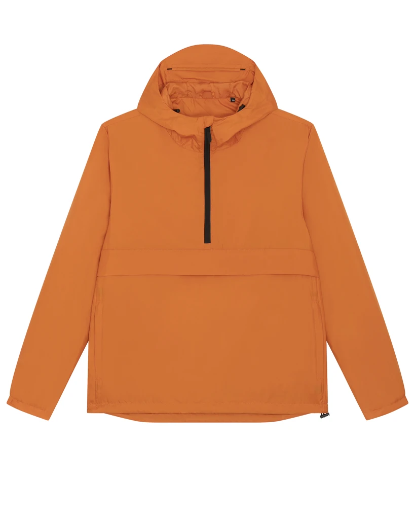 Material: 100% recyceltes Polyester, fluorfreie DWR; Gewicht: 75g/m²; Mittlere Passform, eingesetzte Ärmel, längere Rückenlänge mit abgerundetem Saum zum Schutz, unterer Saum mit verstellbarem Kunststoffstopper und elastischer Kordel, versiegelter Kapuzenschirm, doppellagige Kapuze mit verstellbarem Kunststoffstopper und elastischer Kordel innen, umgekehrter Nylon-Reißverschluss in der Mitte vorne mit Kinnschutz, Leistentaschen mit Reißverschluss und zusätzlichem Grosgrain-Puller, nicht funktionelle Klappe vorne und hinten, halbelastische Ärmelbündchen, Halbmond aus gleichem Stoff am Nacken, Innenreißverschluss am unteren Saum und Innenschlaufe mit Druckknopf am Armloch für einfachen Zugriff für Brustschmuck; Zertifikate: Global Recycled Standard (GRS), Fair Wair, STANDARD 100 by OEKO-TEX®, Peta - Approved VEGAN