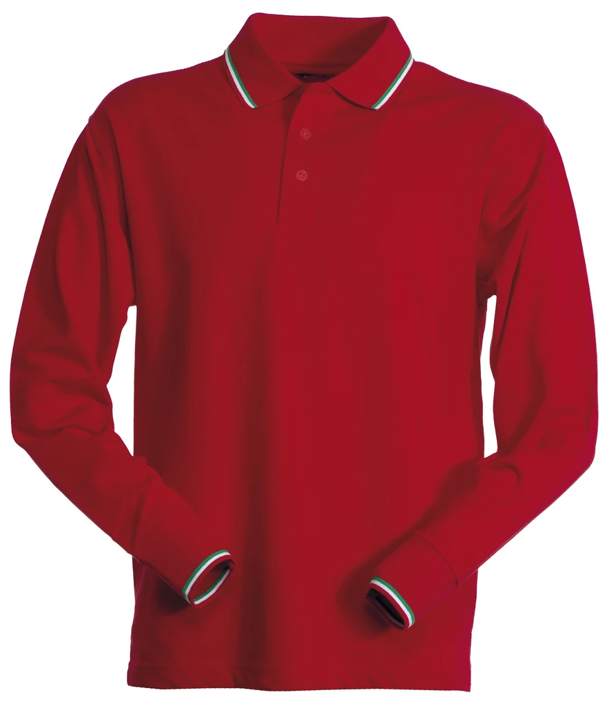 Unisex langärmeliges Poloshirt mit 3 passenden Knöpfen, Kragen- und Ärmelbesatz (Farben der Flagge), Rippkragen und -bündchen, Seitenschlitze, verdeckte Kragensteppung, Seitenverstärkungsband, Nackenband innen