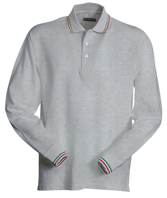 Unisex langärmeliges Poloshirt mit 3 passenden Knöpfen, Kragen- und Ärmelbesatz (Farben der Flagge), Rippkragen und -bündchen, Seitenschlitze, verdeckte Kragensteppung, Seitenverstärkungsband, Nackenband innen