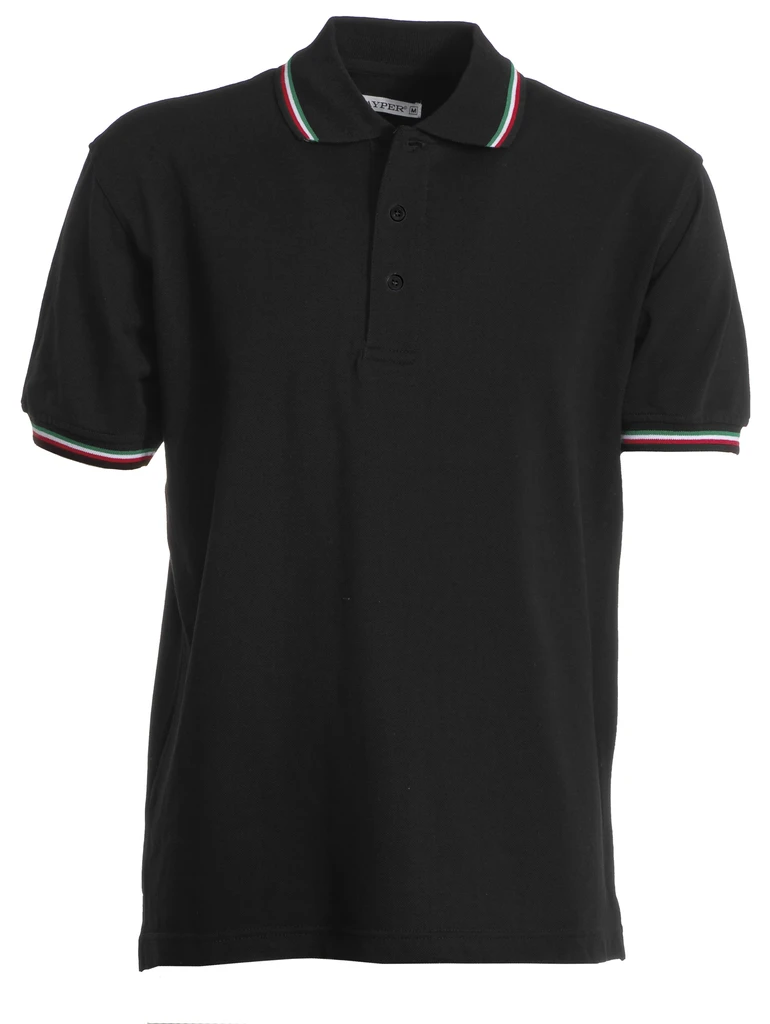 Unisex Kurzarm-Poloshirt mit 3 weißen Knöpfen, farblich abgesetztem Kragen und Ärmelabschluss (Farben der Fahne), Rippkragen und Ärmelabschluss, Seitennähte mit verstärkten Nähten, verdeckte Kragensteppung, Seitenverstärkungsband, Stretchnähte, Nackenband innen