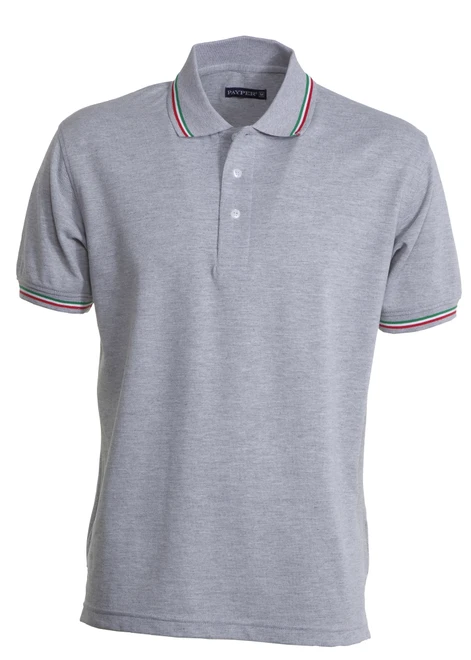 Unisex Kurzarm-Poloshirt mit 3 weißen Knöpfen, farblich abgesetztem Kragen und Ärmelabschluss (Farben der Fahne), Rippkragen und Ärmelabschluss, Seitennähte mit verstärkten Nähten, verdeckte Kragensteppung, Seitenverstärkungsband, Stretchnähte, Nackenband innen
