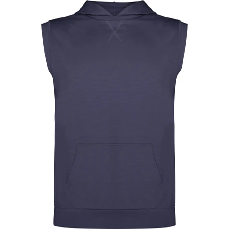 Ärmelloses Kapuzen-Sweatshirt, mit breit geripptem Halsausschnitt, Armausschnitt und Kängurutasche im "Used Look Style" mit offenen Rollsaumkanten. Gekreuzte Ziernähte mittig am Kragen.