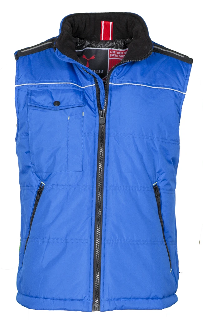 Unisex-Weste mit Reißverschluss und tailliertem Rücken, zwei geräumigen Außentaschen mit Reißverschluss, großer Brusttasche für das Smartphone, Ring zum Anhängen eines Ausweises, Reflex-Paspelierung auf der Brust und auf dem Rücken; Innenseite: Steppund High-Density-Futter, Krageninnenseite aus Fleece, eine Tasche