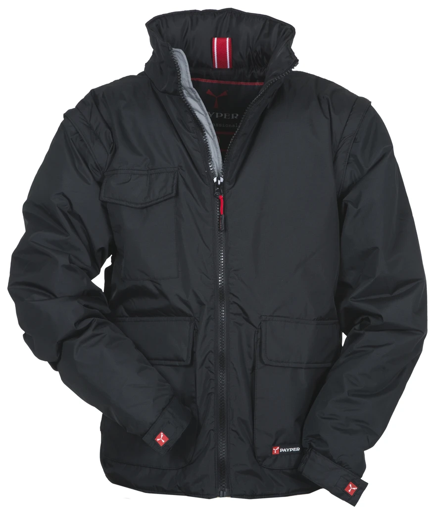 Herren-Jacke, abtrennbare Ärmel, 8 mm Reißverschluss aus Kunststoff mit Metallschieber, im Kragen einrollbare Kapuze, elastische Ärmelbündchen mit Verschluss, 2 geräumige Vordertaschen mit LOCK SYSTEM, 2 Seitentaschen, Handy-Brusttasche. Innenseite: wattiert, Reißverschluss zum einfacheren Veredeln mit Druck und Stick