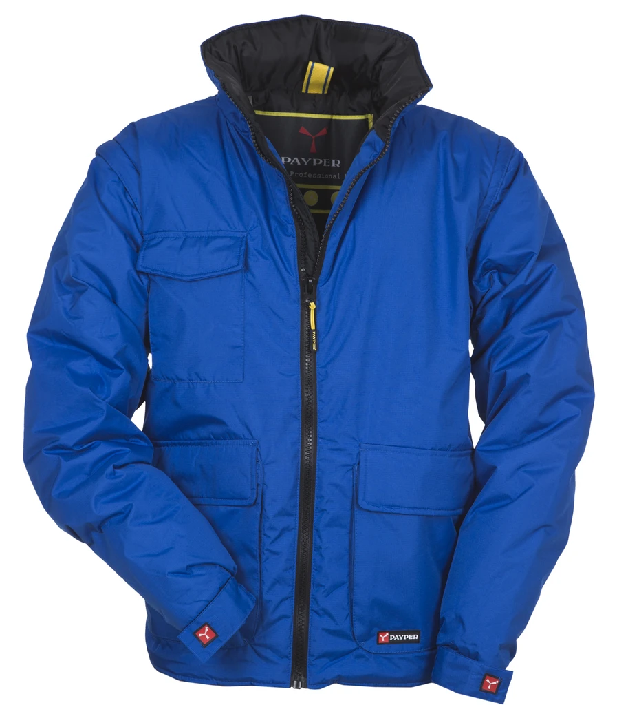 Herren-Jacke, abtrennbare Ärmel, 8 mm Reißverschluss aus Kunststoff mit Metallschieber, im Kragen einrollbare Kapuze, elastische Ärmelbündchen mit Verschluss, 2 geräumige Vordertaschen mit LOCK SYSTEM, 2 Seitentaschen, Handy-Brusttasche. Innenseite: wattiert, Reißverschluss zum einfacheren Veredeln mit Druck und Stick