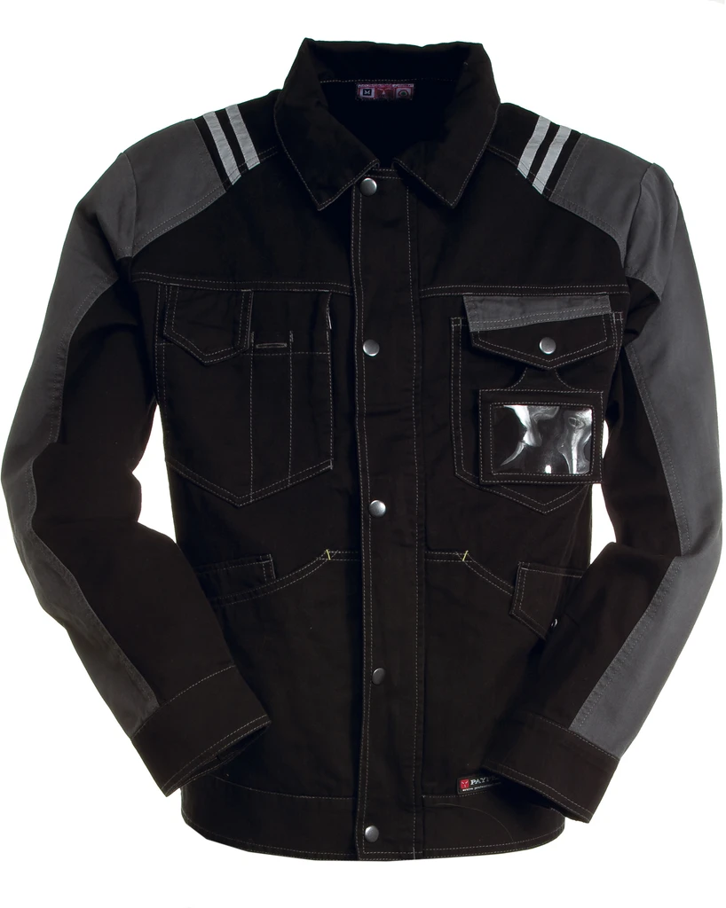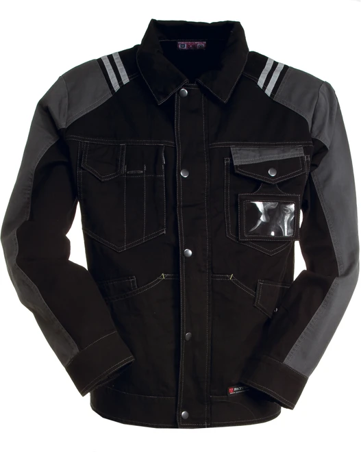 der Ärmelbündchen und Taille mit Knopf, drei Vordertaschen mit LOCK SYSTEM, davon zwei im Känguruschnitt mit Patte und Metallknopf, abtrennbarem und verschließbarem Ausweisfach, einer multifunktionalen Brusttasche; Reflexstreifen auf den Schultern, tailliertem Schnitt im Jeans-Design