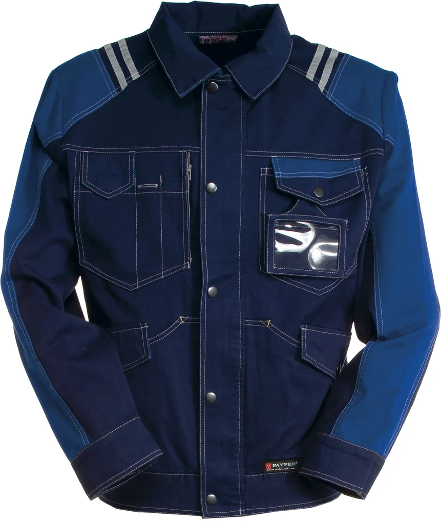 der Ärmelbündchen und Taille mit Knopf, drei Vordertaschen mit LOCK SYSTEM, davon zwei im Känguruschnitt mit Patte und Metallknopf, abtrennbarem und verschließbarem Ausweisfach, einer multifunktionalen Brusttasche; Reflexstreifen auf den Schultern, tailliertem Schnitt im Jeans-Design