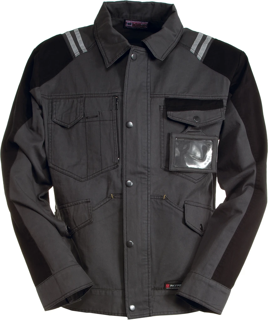 der Ärmelbündchen und Taille mit Knopf, drei Vordertaschen mit LOCK SYSTEM, davon zwei im Känguruschnitt mit Patte und Metallknopf, abtrennbarem und verschließbarem Ausweisfach, einer multifunktionalen Brusttasche; Reflexstreifen auf den Schultern, tailliertem Schnitt im Jeans-Design
