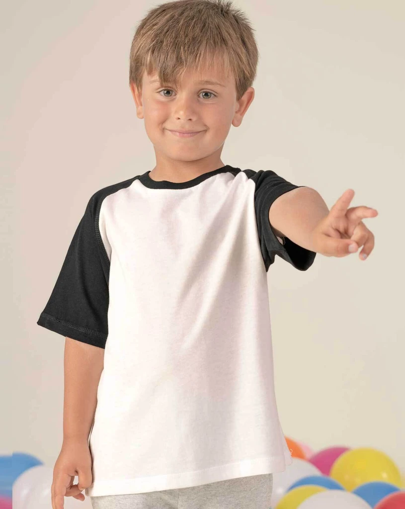 Baseball-T-Shirt für Jungen mit kurzen Ärmeln und Kragen im Kontrast zu Seitennähten, 100% Baumwolle. Abnehmbares Etikett. Verfügbar in 5 Farben.