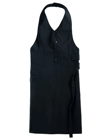 Eine gelungene Mischung aus elegant und praktisch repräsentiert diese Westenschürze. Durch ihren raffinierten Schnitt passt die Schürze mit nur einer Größe allen Mitarbeitern im Team. Das Oberteil hat vier Zierknöpfe, das Nackenband ist mit drei Knöpfen in der Länge verstellbar. In der Taille wird die Schürze mit Schürzenbändern geschlossen. Eine seitlich aufgesetzte Tasche (17x19 cm) mit zwei Fächern bietet genug Stauraum für Arbeitsmaterial. Der besondere Clou sind die aufgesetzten Schlaufen, in denen griffbereit das Serviertuch eingehängt werden kann. 95ºC waschbar, knitterarm, pflegeleicht, farbecht, industriewäsche- und finishertauglich.