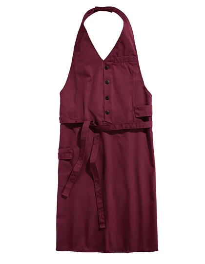 Eine gelungene Mischung aus elegant und praktisch repräsentiert diese Westenschürze. Durch ihren raffinierten Schnitt passt die Schürze mit nur einer Größe allen Mitarbeitern im Team. Das Oberteil hat vier Zierknöpfe, das Nackenband ist mit drei Knöpfen in der Länge verstellbar. In der Taille wird die Schürze mit Schürzenbändern geschlossen. Eine seitlich aufgesetzte Tasche (17x19 cm) mit zwei Fächern bietet genug Stauraum für Arbeitsmaterial. Der besondere Clou sind die aufgesetzten Schlaufen, in denen griffbereit das Serviertuch eingehängt werden kann. 95ºC waschbar, knitterarm, pflegeleicht, farbecht, industriewäsche- und finishertauglich.