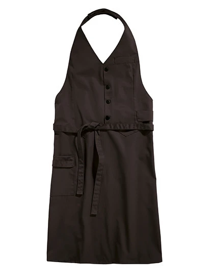 Eine gelungene Mischung aus elegant und praktisch repräsentiert diese Westenschürze. Durch ihren raffinierten Schnitt passt die Schürze mit nur einer Größe allen Mitarbeitern im Team. Das Oberteil hat vier Zierknöpfe, das Nackenband ist mit drei Knöpfen in der Länge verstellbar. In der Taille wird die Schürze mit Schürzenbändern geschlossen. Eine seitlich aufgesetzte Tasche (17x19 cm) mit zwei Fächern bietet genug Stauraum für Arbeitsmaterial. Der besondere Clou sind die aufgesetzten Schlaufen, in denen griffbereit das Serviertuch eingehängt werden kann. 95ºC waschbar, knitterarm, pflegeleicht, farbecht, industriewäsche- und finishertauglich.