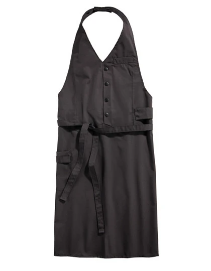 Eine gelungene Mischung aus elegant und praktisch repräsentiert diese Westenschürze. Durch ihren raffinierten Schnitt passt die Schürze mit nur einer Größe allen Mitarbeitern im Team. Das Oberteil hat vier Zierknöpfe, das Nackenband ist mit drei Knöpfen in der Länge verstellbar. In der Taille wird die Schürze mit Schürzenbändern geschlossen. Eine seitlich aufgesetzte Tasche (17x19 cm) mit zwei Fächern bietet genug Stauraum für Arbeitsmaterial. Der besondere Clou sind die aufgesetzten Schlaufen, in denen griffbereit das Serviertuch eingehängt werden kann. 95ºC waschbar, knitterarm, pflegeleicht, farbecht, industriewäsche- und finishertauglich.