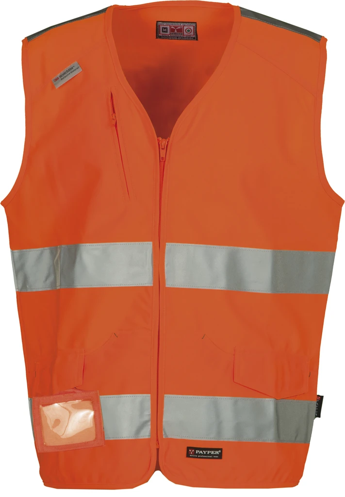 Warnweste mit 3M-Streifen, Reißverschluss, zwei Vordertaschen mit LOCK SYSTEM im Känguruschnitt, abtrennbarem und verschließbarem Ausweisfach, einer Brusttasche mit Reißverschluss