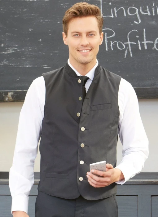 Die figurbetonte Weste erhält ihre schöne Passform durch Teilungsnähte hinten und vorne. Mit abgestepptem Stehkragen, drei Paspeltaschen und kleinen Seitenschlitzen. Die Weite kann durch ein Zugband im Rücken reguliert werden. Die Herrenweste ist vorne abgerundet. Standardmäßig ist die Weste mit abnehmbaren, schwarzen Knöpfen ausgestattet. Austauschknöpfe in matt silber sind separat erhältlich. 95° C waschbar, pflegeleicht, farbecht, industriewäsche- und finishertauglich.
