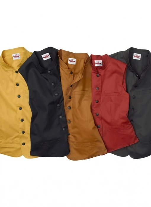 Die figurbetonte Weste erhält ihre schöne Passform durch Teilungsnähte hinten und vorne. Mit abgestepptem Stehkragen, drei Paspeltaschen und kleinen Seitenschlitzen. Die Weite kann durch ein Zugband im Rücken reguliert werden. Die Damenweste läuft vorne leicht spitz zu. Standardmäßig ist die Weste mit abnehmbaren, schwarzen Knöpfen ausgestattet. Austauschknöpfe in matt silber sind separat erhältlich. 95° C waschbar, pflegeleicht, farbecht, industriewäsche- und finishertauglich.