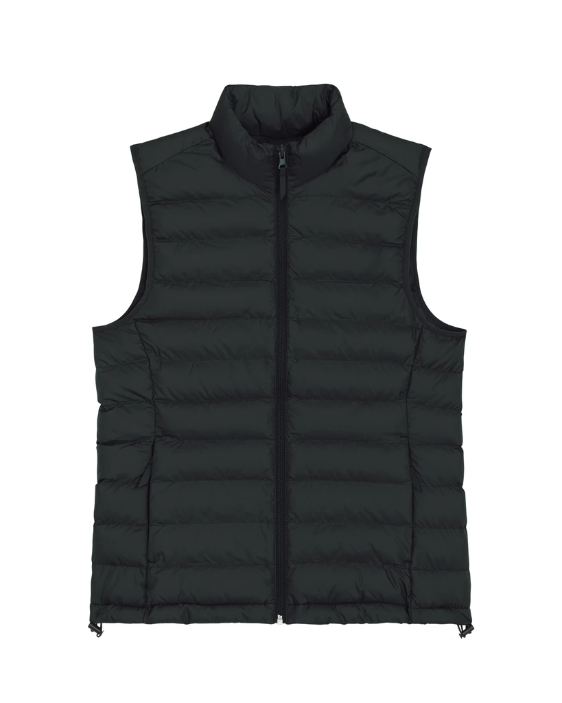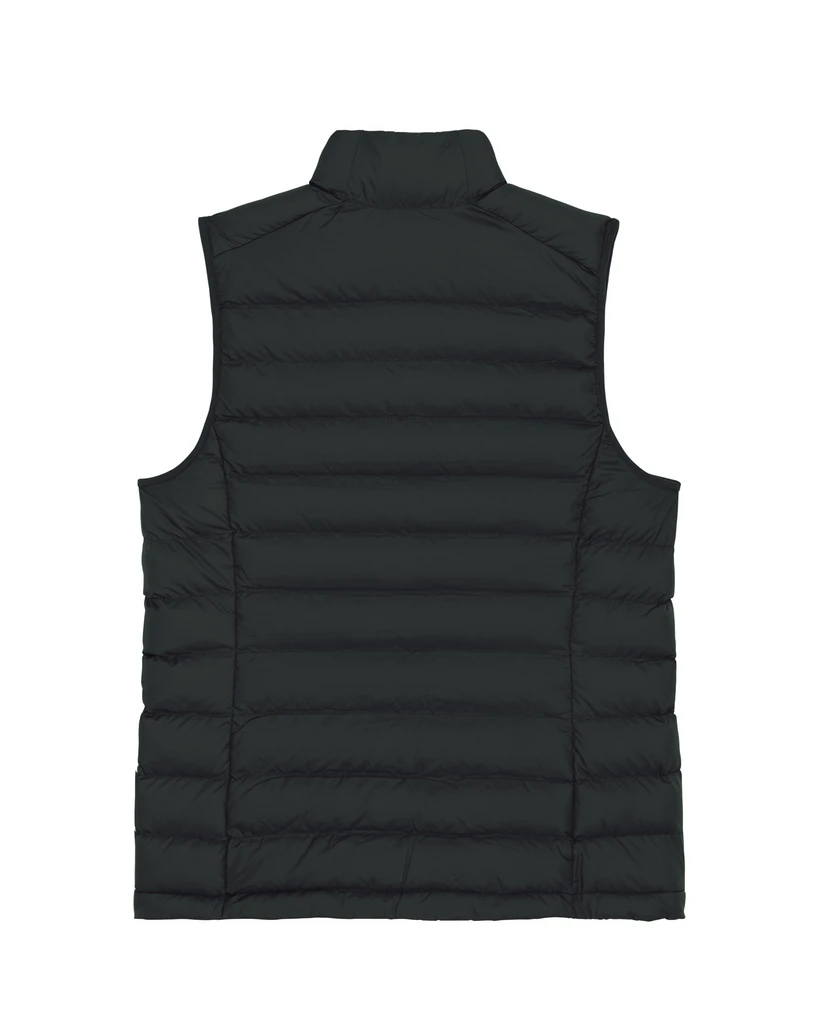 Material: 100 % recyceltes Polyester, fluorfreie DWR; Gewicht: 75g/m²; Taillierter Schnitt, ärmellos, hoher Kragen, umgekehrter Nylon-Reißverschluss vorne in der Mitte, Leistentaschen mit Reißverschluss und zusätzlichem Grosgrain-Puller, elastisches Band am Armloch, vollständig gesteppt, Seiteneinsätze für eine bessere Form, innen eingefasste Nähte, unterer Saum mit verstellbarem Kunststoffstopper und Gummizug Kabel; Zertifikate: Global Recycled Standard (GRS), Fair Wair, STANDARD 100 by OEKO-TEX®, Peta - Approved VEGAN
