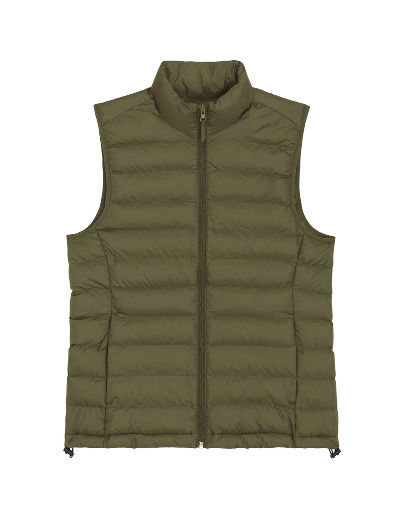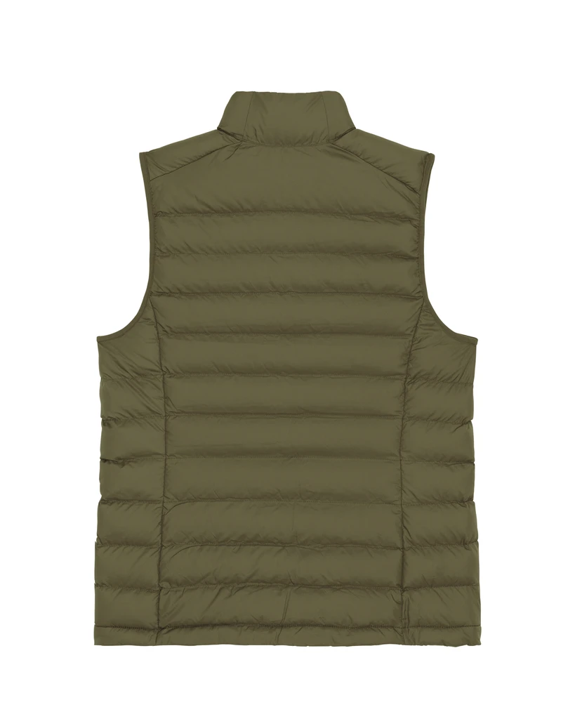 Material: 100 % recyceltes Polyester, fluorfreie DWR; Gewicht: 75g/m²; Taillierter Schnitt, ärmellos, hoher Kragen, umgekehrter Nylon-Reißverschluss vorne in der Mitte, Leistentaschen mit Reißverschluss und zusätzlichem Grosgrain-Puller, elastisches Band am Armloch, vollständig gesteppt, Seiteneinsätze für eine bessere Form, innen eingefasste Nähte, unterer Saum mit verstellbarem Kunststoffstopper und Gummizug Kabel; Zertifikate: Global Recycled Standard (GRS), Fair Wair, STANDARD 100 by OEKO-TEX®, Peta - Approved VEGAN