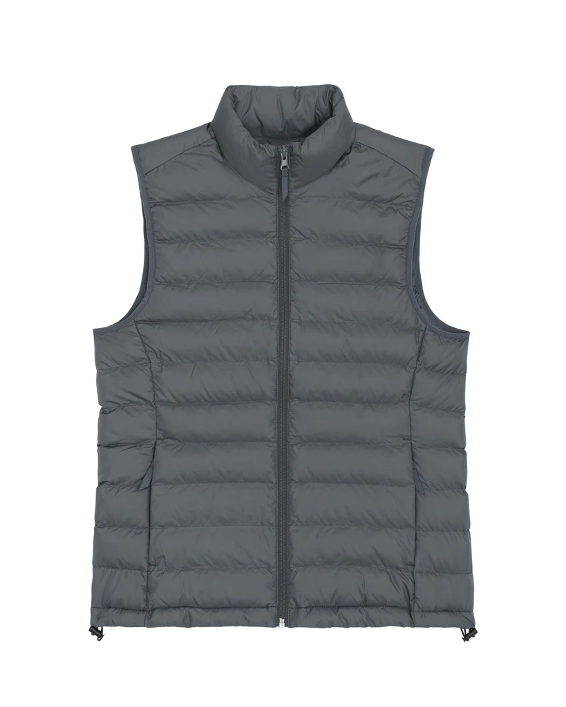 Material: 100 % recyceltes Polyester, fluorfreie DWR; Gewicht: 75g/m²; Taillierter Schnitt, ärmellos, hoher Kragen, umgekehrter Nylon-Reißverschluss vorne in der Mitte, Leistentaschen mit Reißverschluss und zusätzlichem Grosgrain-Puller, elastisches Band am Armloch, vollständig gesteppt, Seiteneinsätze für eine bessere Form, innen eingefasste Nähte, unterer Saum mit verstellbarem Kunststoffstopper und Gummizug Kabel; Zertifikate: Global Recycled Standard (GRS), Fair Wair, STANDARD 100 by OEKO-TEX®, Peta - Approved VEGAN