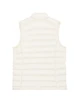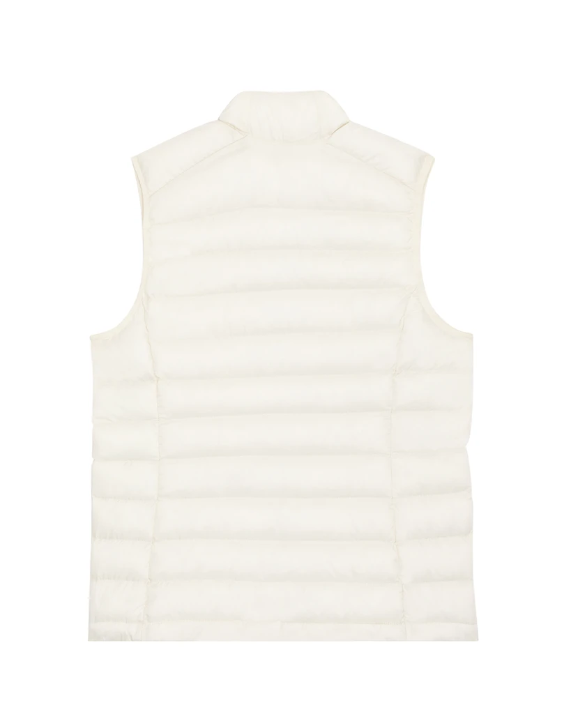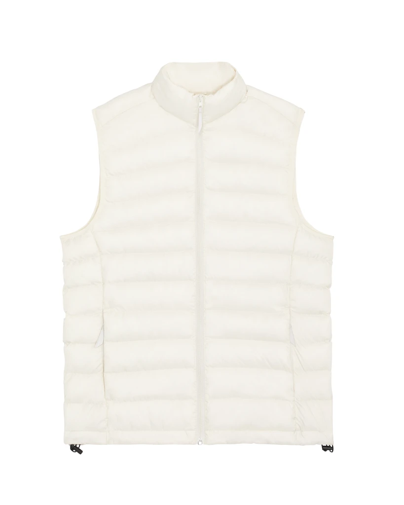Material: 100 % recyceltes Polyester, fluorfreie DWR; Gewicht: 75g/m²; Taillierter Schnitt, ärmellos, hoher Kragen, umgekehrter Nylon-Reißverschluss vorne in der Mitte, Leistentaschen mit Reißverschluss und zusätzlichem Grosgrain-Puller, elastisches Band am Armloch, vollständig gesteppt, Seiteneinsätze für eine bessere Form, innen eingefasste Nähte, unterer Saum mit verstellbarem Kunststoffstopper und Gummizug Kabel; Zertifikate: Global Recycled Standard (GRS), Fair Wair, STANDARD 100 by OEKO-TEX®, Peta - Approved VEGAN