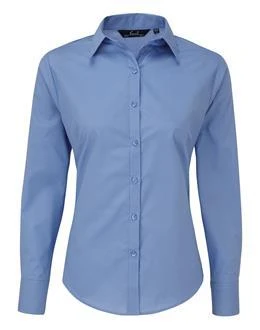 Eine stilvolle Damenbluse mit langen Ärmeln, die in 27 Farben erhältlich ist. Diese Bluse bietet der Trägerin einen halb taillierten, femininen Stil mit weichem Kragen, Brust, Abnähern auf der Rückseite und einem abgerundeten unteren Saum.