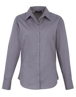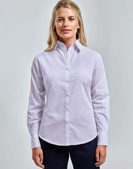 Eine stilvolle Damenbluse mit langen Ärmeln, die in 27 Farben erhältlich ist. Diese Bluse bietet der Trägerin einen halb taillierten, femininen Stil mit weichem Kragen, Brust, Abnähern auf der Rückseite und einem abgerundeten unteren Saum.